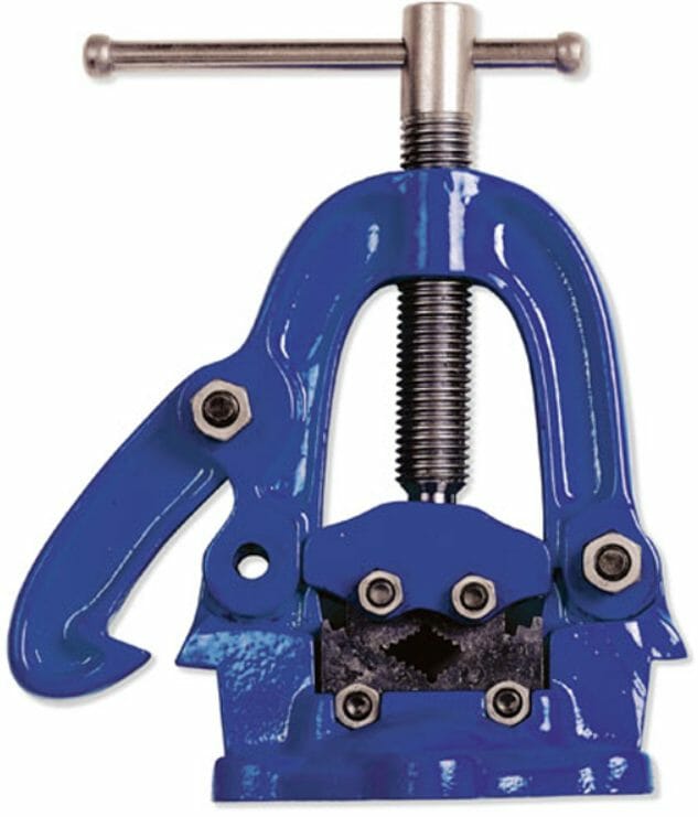 The hinged pipe vice frame and base are cast from high-impact resistant S.G. ductile iron guaranteeing strength.